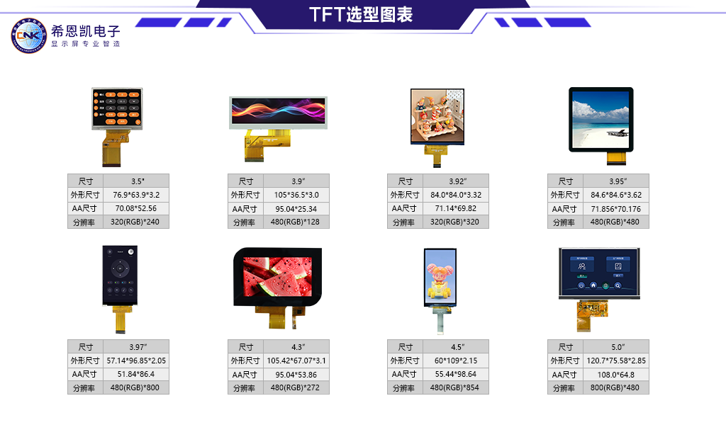 Pokud jde o moduly TFT s barevnou obrazovkou, společnost zvládla kompletní výrobní proces od řezání skla, připevnění polarizátoru až po připojení IC ovladače a montáž podsvícení. Její produkty podporují různé způsoby řízení, jako je rozhraní RGB, rozhraní MCU a rozhraní SPI, a mohou se flexibilně přizpůsobit různým hlavním řídicím platformám.